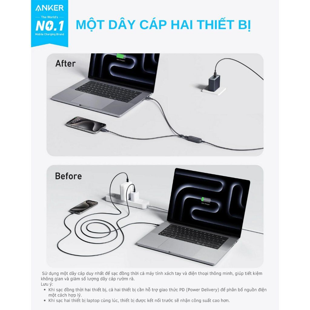 Điểm nổi bật của cáp Anker A8895 là thiết kế đặc biệt với một đầu USB-C để cắm vào củ sạc hoặc laptop, và hai đầu USB-C ở đầu kia, cho phép bạn sạc đồng thời hai thiết bị USB-C cùng một lúc.
