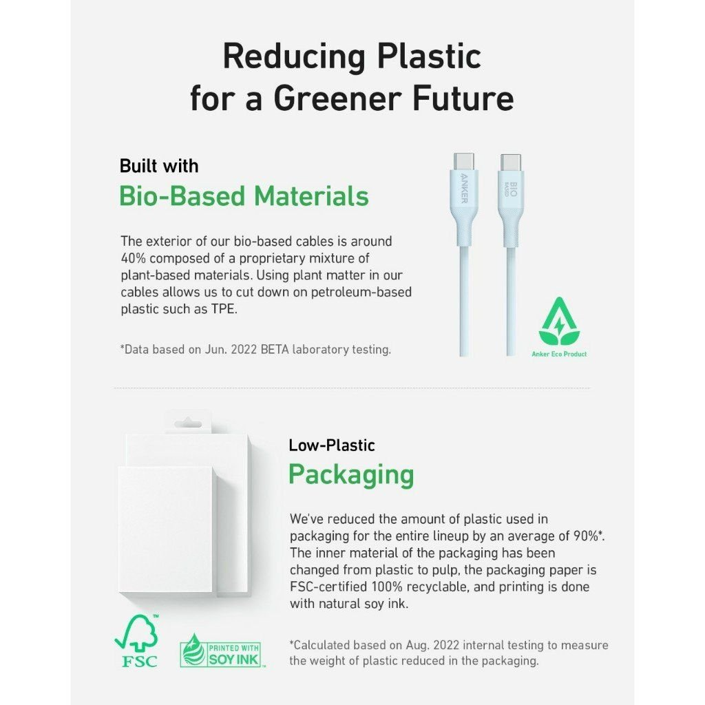 Anker tiếp tục khẳng định cam kết với môi trường bằng việc sử dụng vật liệu TPE có nguồn gốc sinh học cho cáp 544. Lựa chọn này không chỉ bền vững mà còn mang lại cảm giác mềm mại, dễ chịu khi cầm nắm.