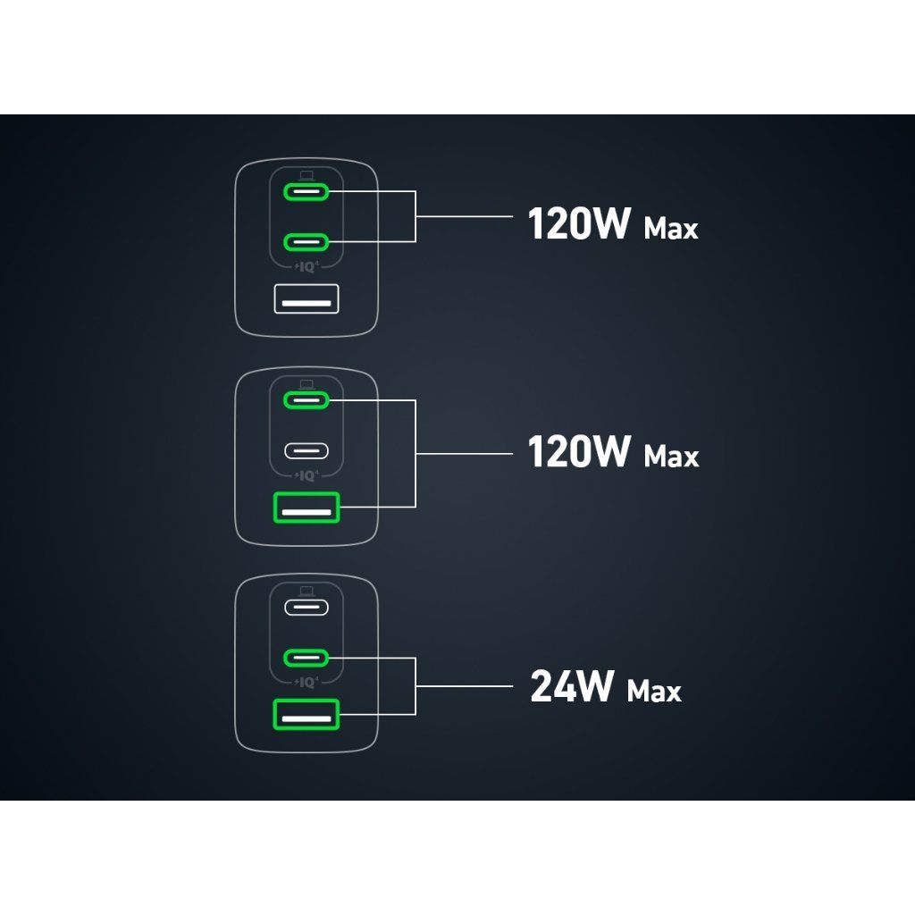 USB-C1 + USB-C2 + USB-A Output: 120W Max