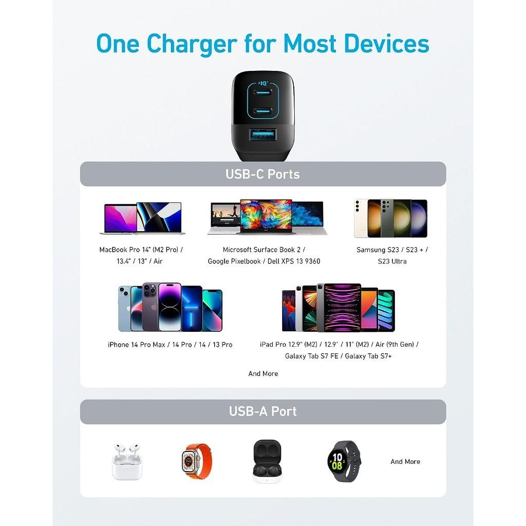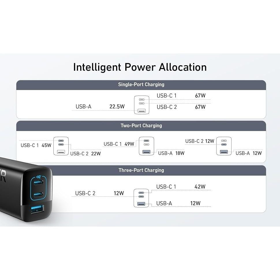Củ sạc Anker A2674 sở hữu tổng công suất lên đến 67W, cho phép bạn sạc nhanh chóng nhiều loại thiết bị. Với hai cổng USB-C hỗ trợ Power Delivery (PD), bạn có thể sạc nhanh các dòng điện thoại thông minh, máy tính bảng và thậm chí cả một số laptop MacBook Air một cách hiệu quả, tiết kiệm đáng kể thời gian chờ đợi.