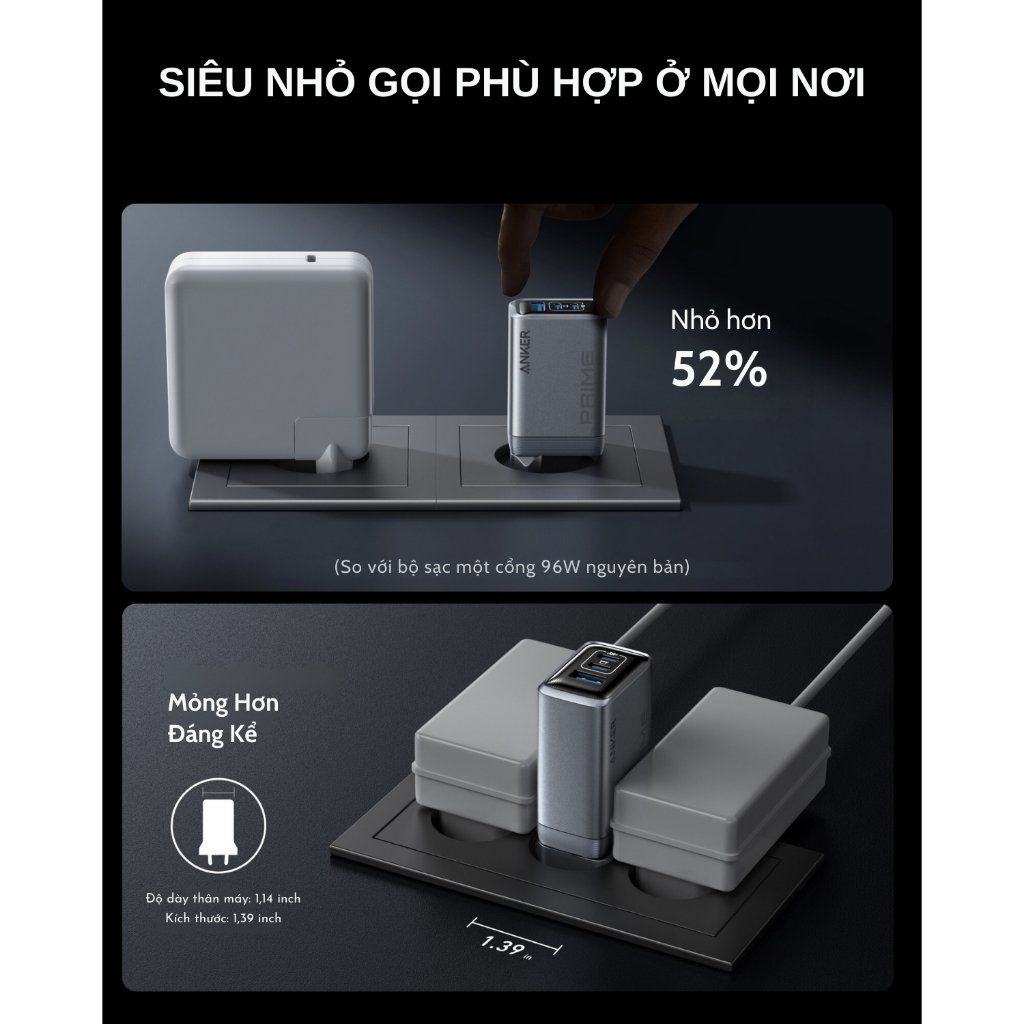 Anker GaNPrime là sự kết hợp hoàn hảo giữa công nghệ GaN (Gallium Nitride) tiên tiến và những cải tiến vượt trội trong thiết kế. Nhờ đó, củ sạc A2688 sở hữu kích thước nhỏ gọn hơn, hiệu suất sạc cao hơn và ít tỏa nhiệt hơn so với các củ sạc truyền thống.