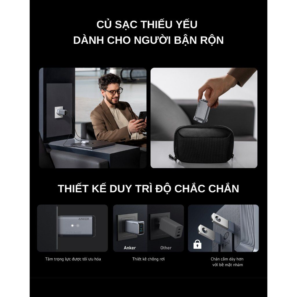 Củ sạc Anker GaNPrime A2688 sở hữu thiết kế hiện đại, với lớp vỏ ngoài bền bỉ, chống trầy xước và tản nhiệt hiệu quả. Kích thước nhỏ gọn giúp bạn dễ dàng mang theo trong những chuyến đi công tác hay du lịch.
