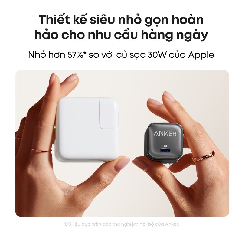 Đúng như tên gọi “Nano”, củ sạc này sở hữu kích thước vô cùng nhỏ gọn, có thể nằm lọt thỏm trong lòng bàn tay. Nó nhỏ hơn đáng kể so với các củ sạc 45W truyền thống trên thị trường. Thiết kế chân cắm gập (tùy phiên bản khu vực) kết hợp cùng trọng lượng nhẹ giúp bạn dễ dàng cất gọn vào túi xách, balo hay thậm chí là túi quần mà không hề chiếm diện tích, cực kỳ tiện lợi cho những chuyến du lịch hay công tác.