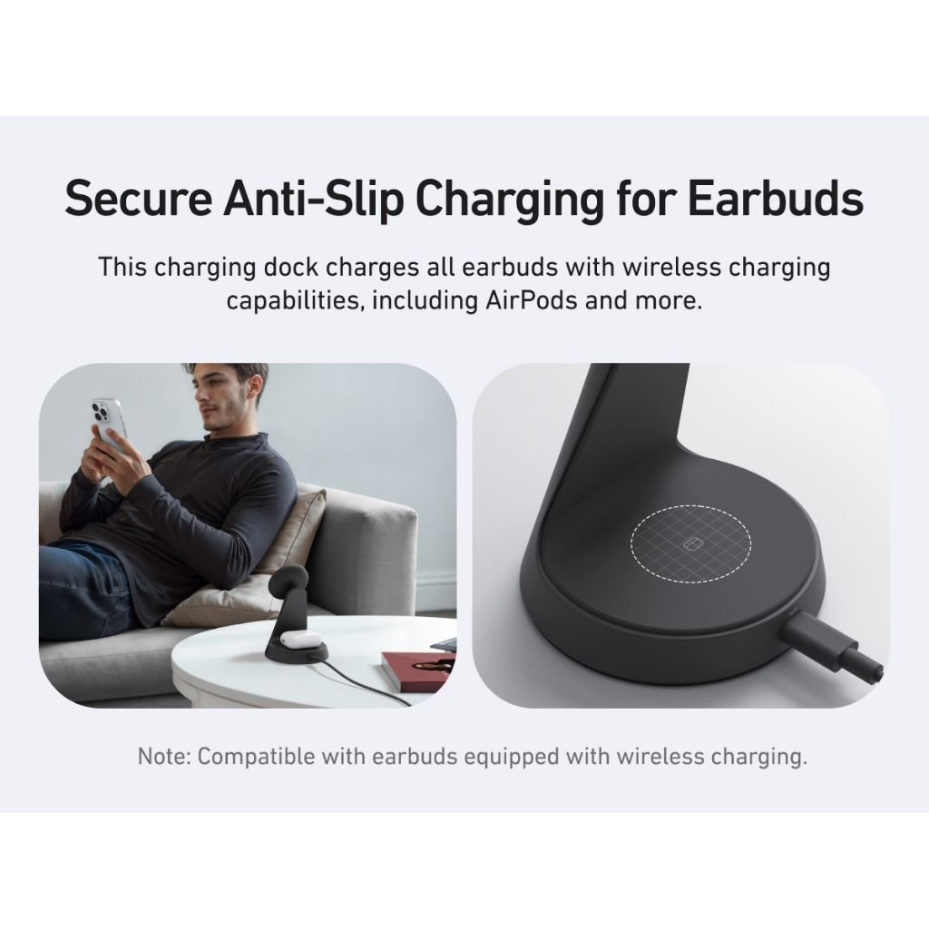 Đế sạc còn tích hợp một khu vực sạc không dây ở phần chân đế, được thiết kế để sạc AirPods và các tai nghe không dây khác có hỗ trợ chuẩn Qi với công suất tối đa 5W. Bạn chỉ cần đặt hộp sạc AirPods lên là quá trình sạc sẽ tự động bắt đầu.