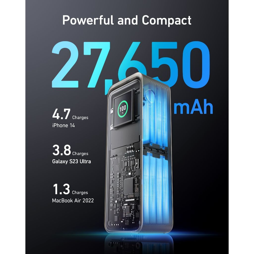 Với dung lượng 27,650mAh, Anker Prime (A1340) có khả năng cung cấp năng lượng cho mọi nhu cầu của bạn. Bạn có thể sạc lại MacBook Air 13 inch (M2) đến 1.28 lần, iPhone 14 khoảng 4.67 lần, hoặc cung cấp năng lượng cho vô số các thiết bị khác.