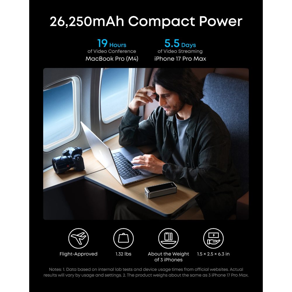 Sở hữu dung lượng pin cực lớn 26.250mAh (99.75Wh), sản phẩm cung cấp nguồn năng lượng dồi dào, có thể sạc đầy iPhone 15/16 khoảng 4-5 lần hoặc MacBook Pro (M4) khoảng 0.8 lần. Đặc biệt, mức dung lượng này được thiết kế dưới 100Wh, hoàn toàn tuân thủ quy định của TSA/FAA, cho phép bạn thoải mái mang theo trong hành lý xách tay khi đi máy bay.