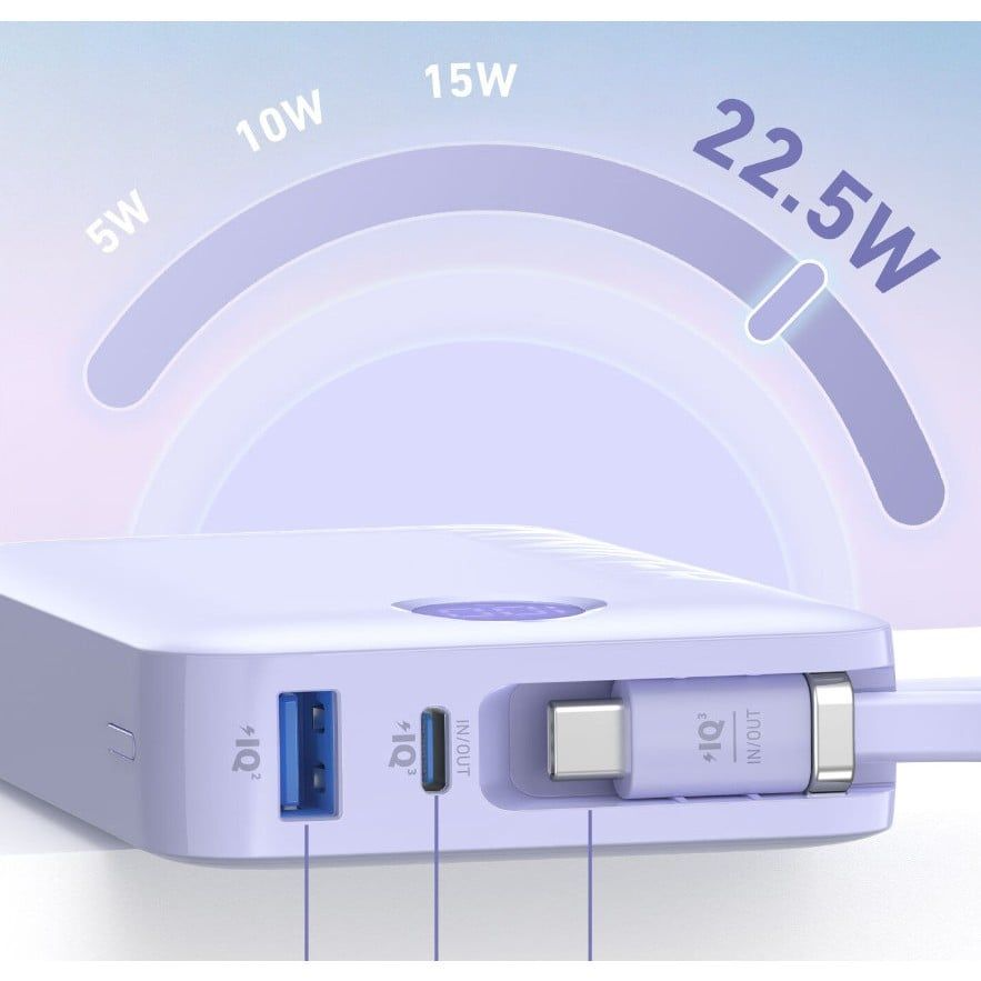 Với công suất đầu ra tối đa 22.5W qua cả cáp USB-C tích hợp và cổng USB-C riêng, pin dự phòng này hỗ trợ sạc nhanh cho nhiều thiết bị, giúp bạn tiết kiệm thời gian sạc đáng kể.