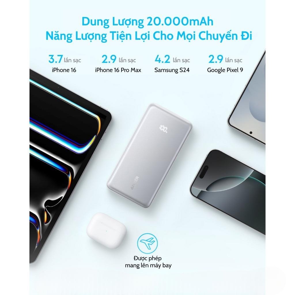 Với dung lượng pin lên đến 20.000mAh, Anker Zolo A110E cung cấp nguồn năng lượng dồi dào cho nhiều ngày sử dụng. Bạn có thể sạc đầy một chiếc iPhone 15 khoảng 4 lần hoặc một chiếc Samsung Galaxy S24 Ultra hơn 3 lần. Đây là lựa chọn lý tưởng cho những chuyến công tác dài ngày, các buổi dã ngoại hay đơn giản là sự yên tâm tuyệt đối khi bạn di chuyển liên tục.