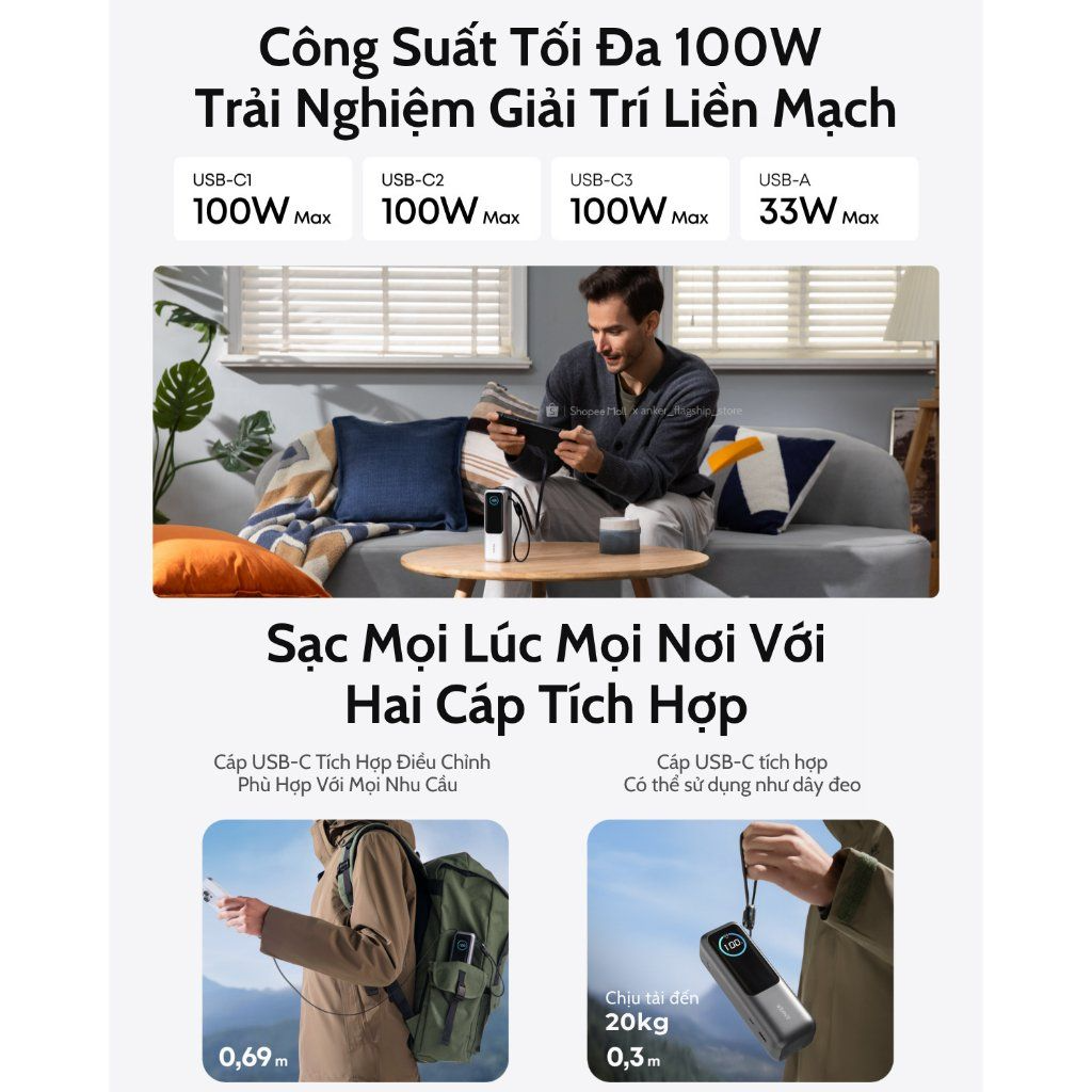 Pin dự phòng Anker Zolo A1695 còn được trang bị 2 cáp USB-C tích hợp (một cáp dài 70cm và một cáp ngắn 30cm) giúp bạn dễ dàng sạc cho các thiết bị mà không cần phải mang theo cáp riêng. Màn hình màu 1.3 inch hiển thị thông minh các thông tin về dung lượng pin còn lại, tốc độ sạc, thời gian sạc lại, và nhiều thông tin khác, giúp bạn dễ dàng quản lý quá trình sạc.