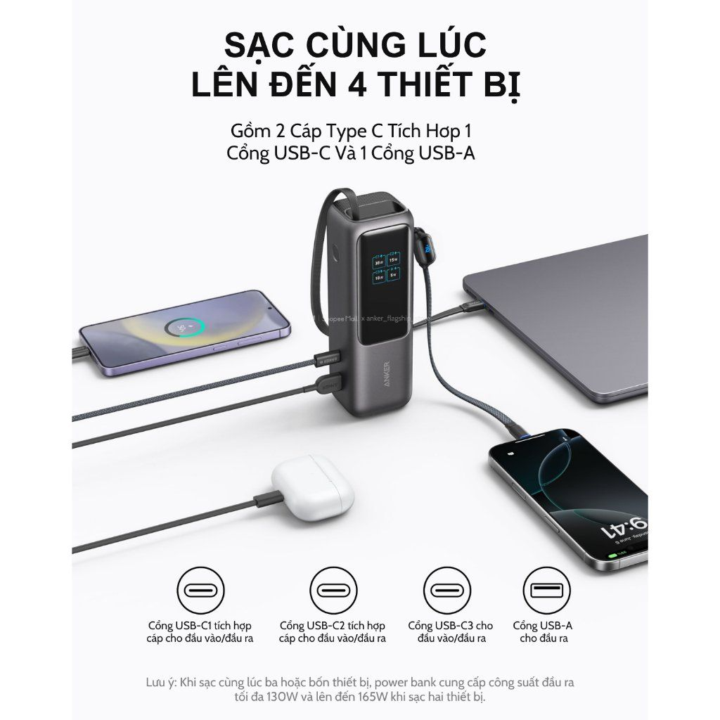 Với 2 cổng USB-C hỗ trợ sạc nhanh 100W cho phép bạn sạc đồng thời 2 laptop một cách nhanh chóng. Cổng USB-A với công suất 33W giúp sạc nhanh chóng cho điện thoại và các thiết bị khác. Tổng công suất lên đến 165W đảm bảo mọi thiết bị của bạn luôn sẵn sàng hoạt động.