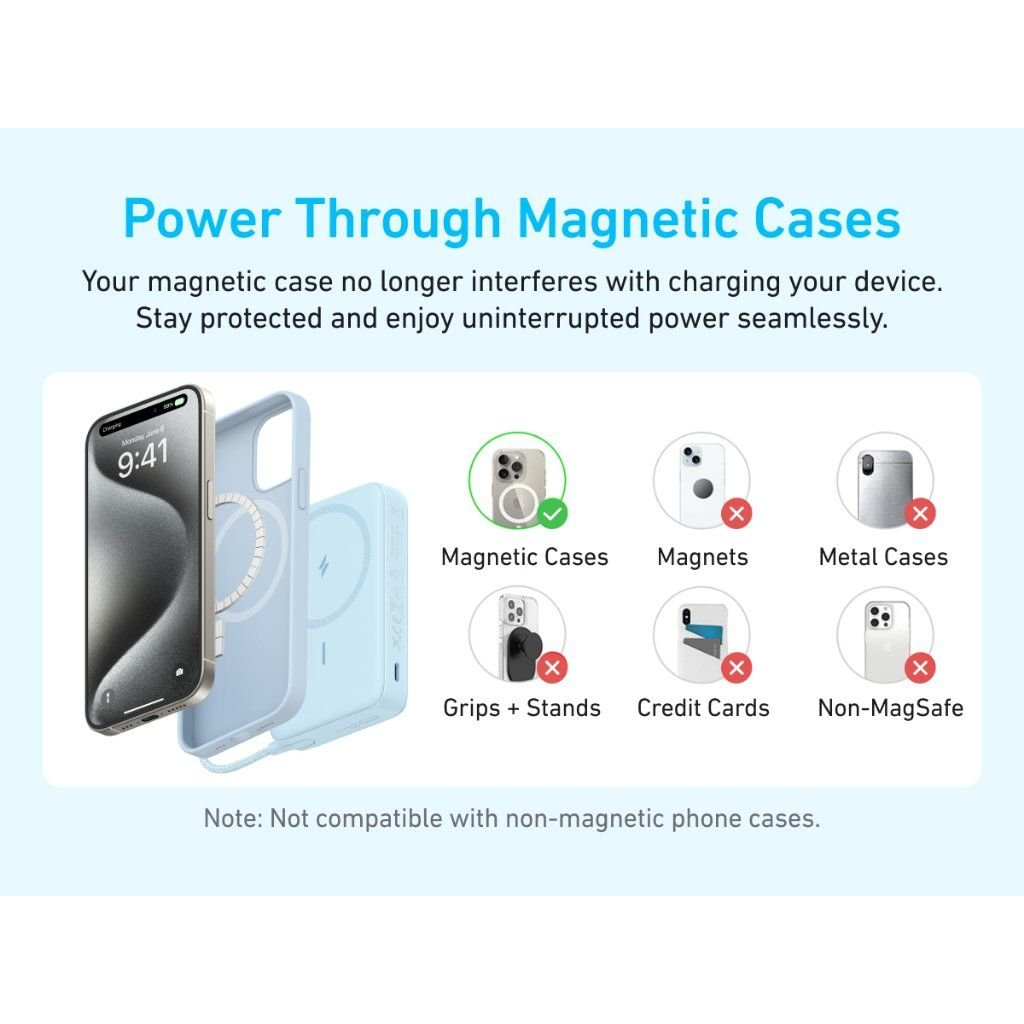 Anker Zolo A1684 được trang bị khả năng sạc không dây từ tính, tương thích hoàn hảo với các dòng iPhone hỗ trợ MagSafe. Chỉ cần đặt chiếc iPhone của bạn lên bề mặt pin, nam châm tích hợp sẽ tự động hút chặt, đảm bảo quá trình sạc ổn định và không bị gián đoạn.