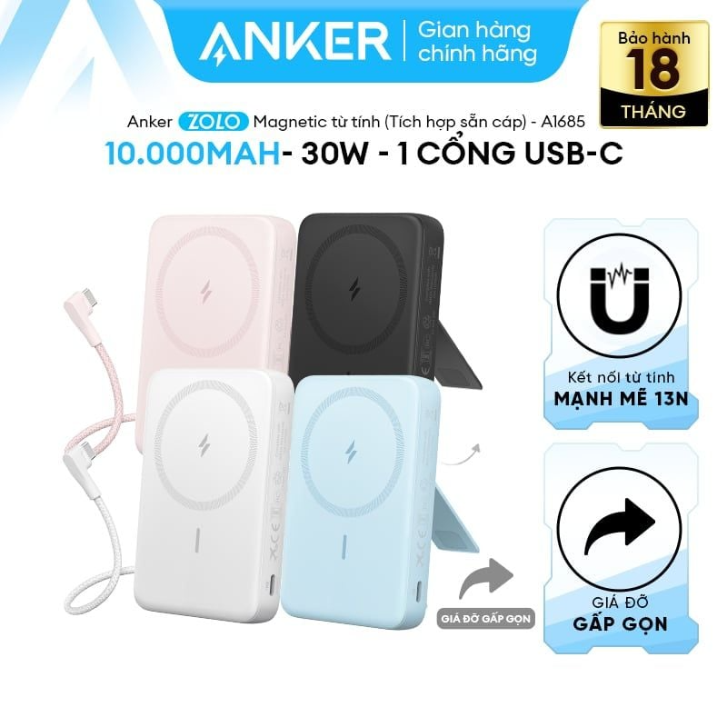 Hình Ảnh Pin Dự Phòng Từ Tính Kiêm Sạc Không Dây Qi Kèm Cáp Type-C ANKER Zolo A1685 10000mAh 30W (With Stand, Sạc Không Dây 7.5W)