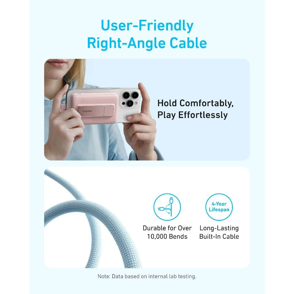Điểm đặc biệt của Anker Zolo A1685 là cáp USB-C được tích hợp ngay trên thân pin. Bạn có thể sử dụng cáp này để sạc cho hầu hết các thiết bị có cổng USB-C và đồng thời cũng có thể dùng chính cáp này để sạc lại cho pin dự phòng. Cáp được thiết kế bền bỉ, có thể chịu được hơn 10.000 lần gập.