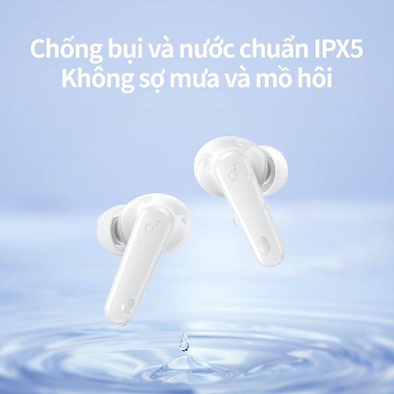 Với chuẩn kháng nước IPX5, Soundcore R50i được bảo vệ an toàn trước mồ hôi khi bạn tập luyện thể thao cường độ cao hay những cơn mưa phùn bất chợt. Thiết kế công thái học nhẹ nhàng (chỉ khoảng 45.36g) cũng giúp tai nghe nằm gọn và êm ái trên tai suốt ngày dài.