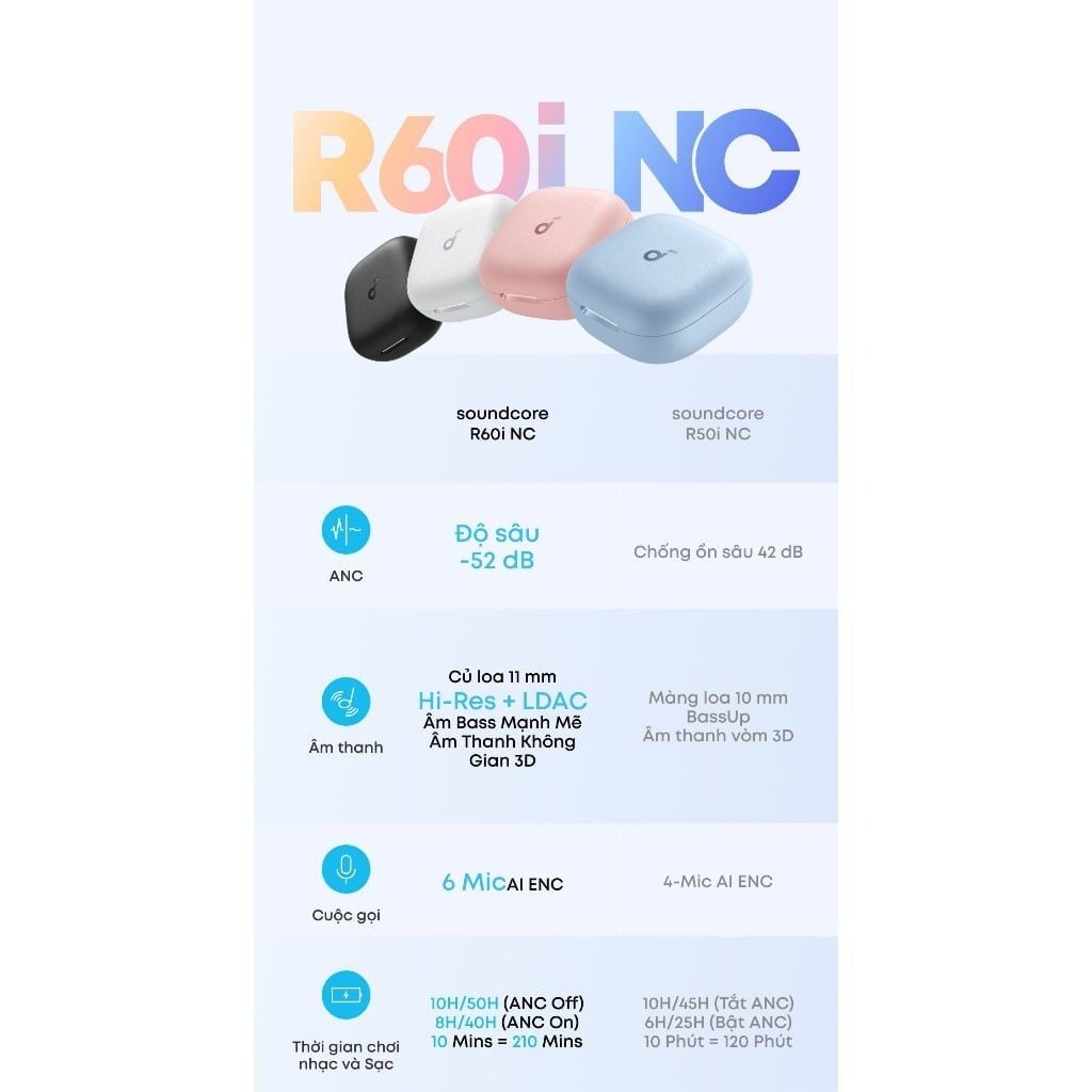 Tai Nghe Không Dây TWS SOUNDCORE R60i NC (Bluetooth v6.1, Adaptive ANC, Hi-Res Certified Sound with LDAC, 10H, IP55, Supports Real-Time 100+ AI Translation, Support Google Fast Pair, Dual Connections, 6 AI-Enhanced Mics for Clear Calls)
