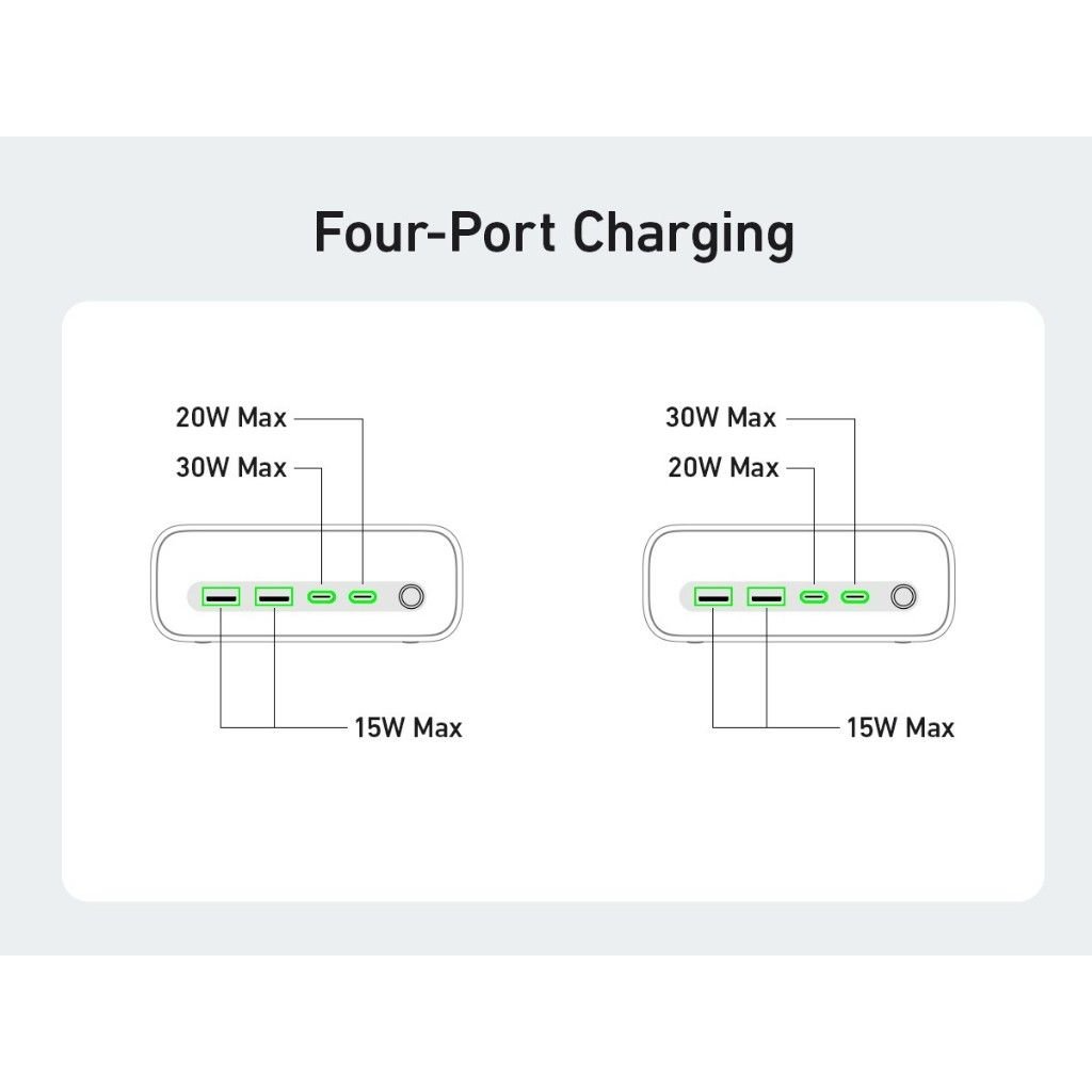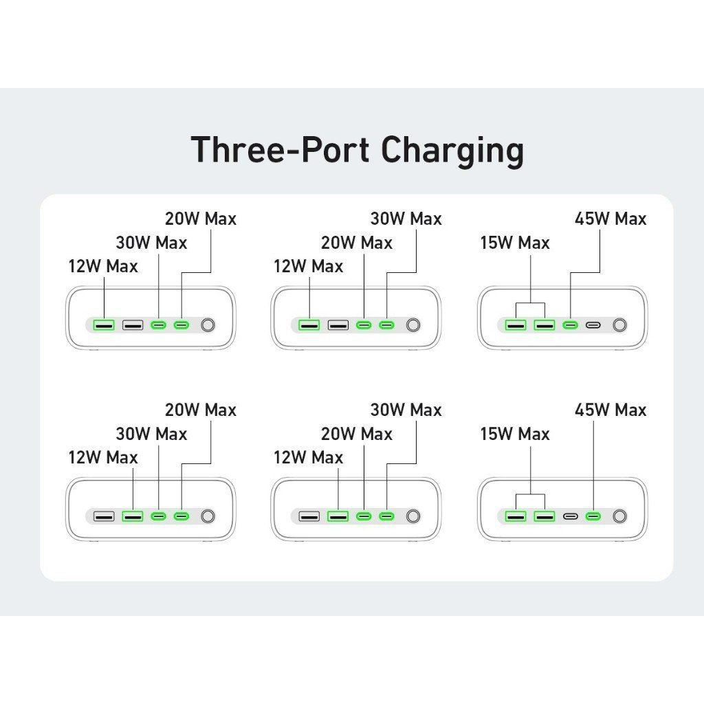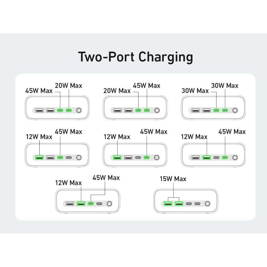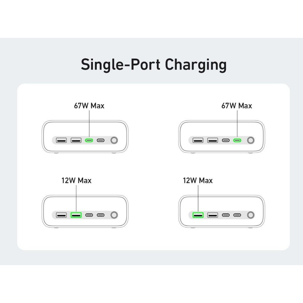 Trạm sạc này cung cấp tổng công suất lên đến 67W, đảm bảo khả năng sạc nhanh và ổn định cho nhiều loại thiết bị. Cổng USB-C hỗ trợ Power Delivery (PD) cho phép sạc nhanh laptop và các thiết bị USB-C tương thích khác.